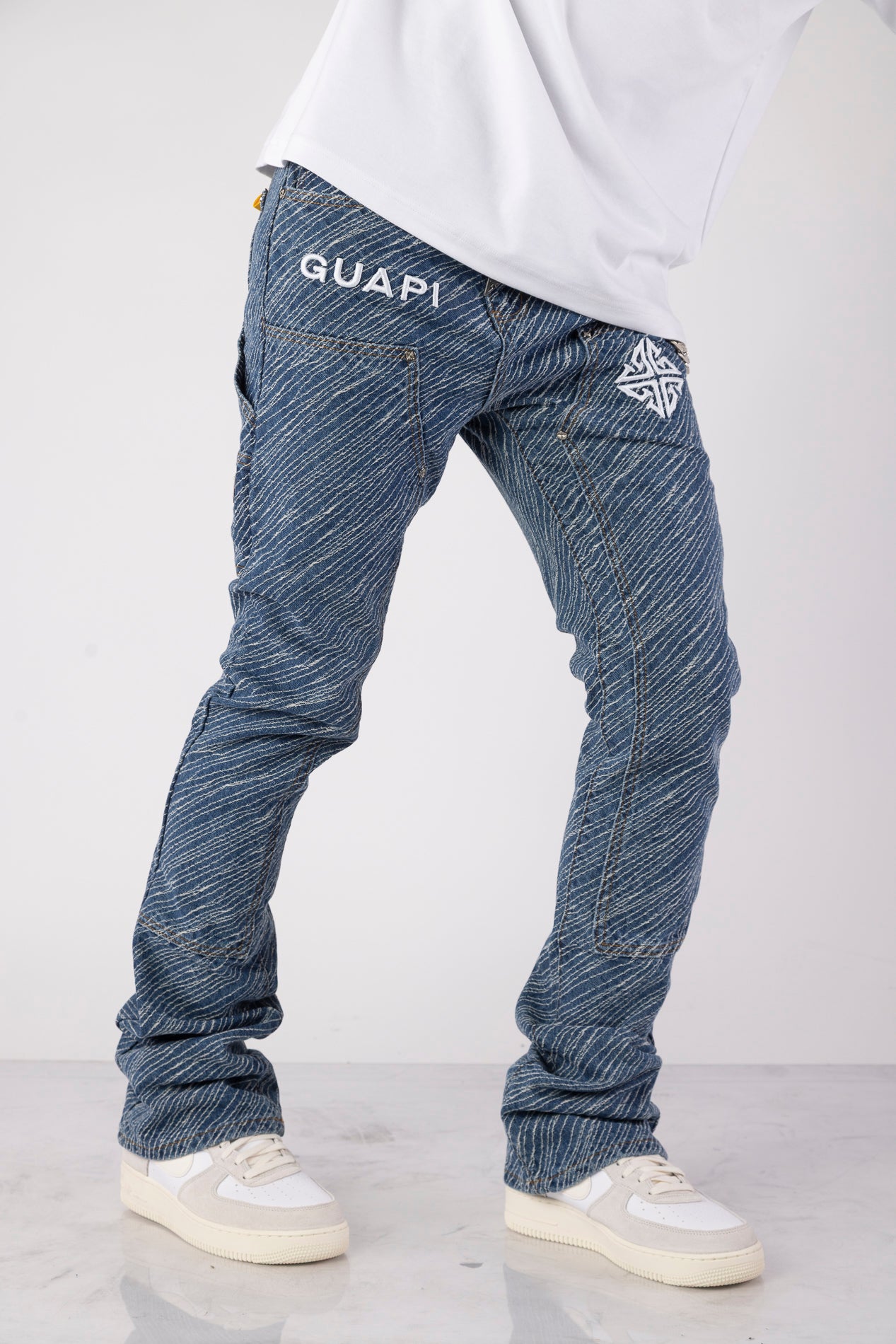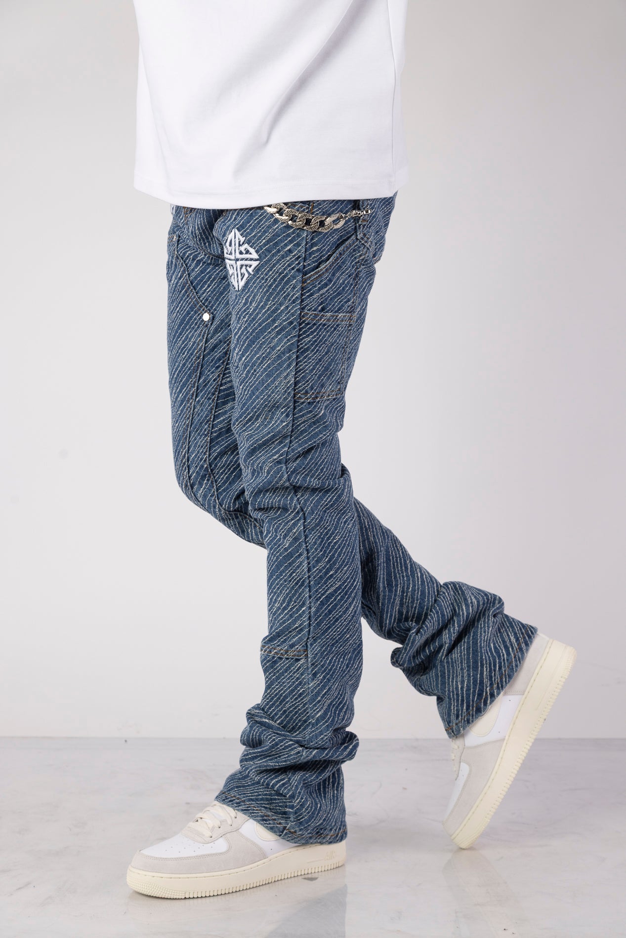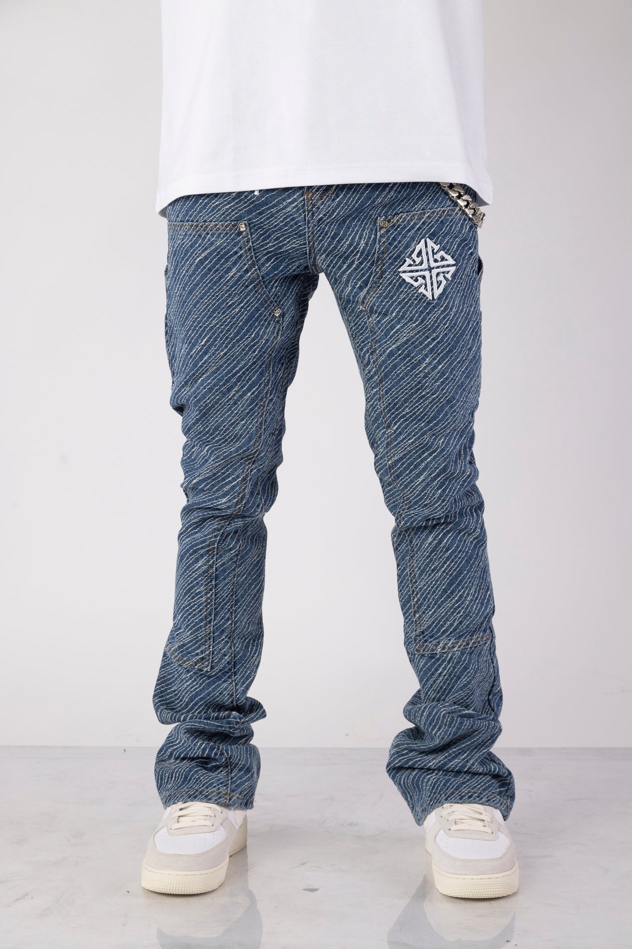 Unleash bold energy with the Aqua Blue Striker Denim, engineered for those who move with purpose and style. These jeans make a visual impact through an electric all-over textured stripe wash, adding depth and attitude to every step. Featuring an assertive silhouette, this piece is crafted to energize your fit with a striking streetwear edge.