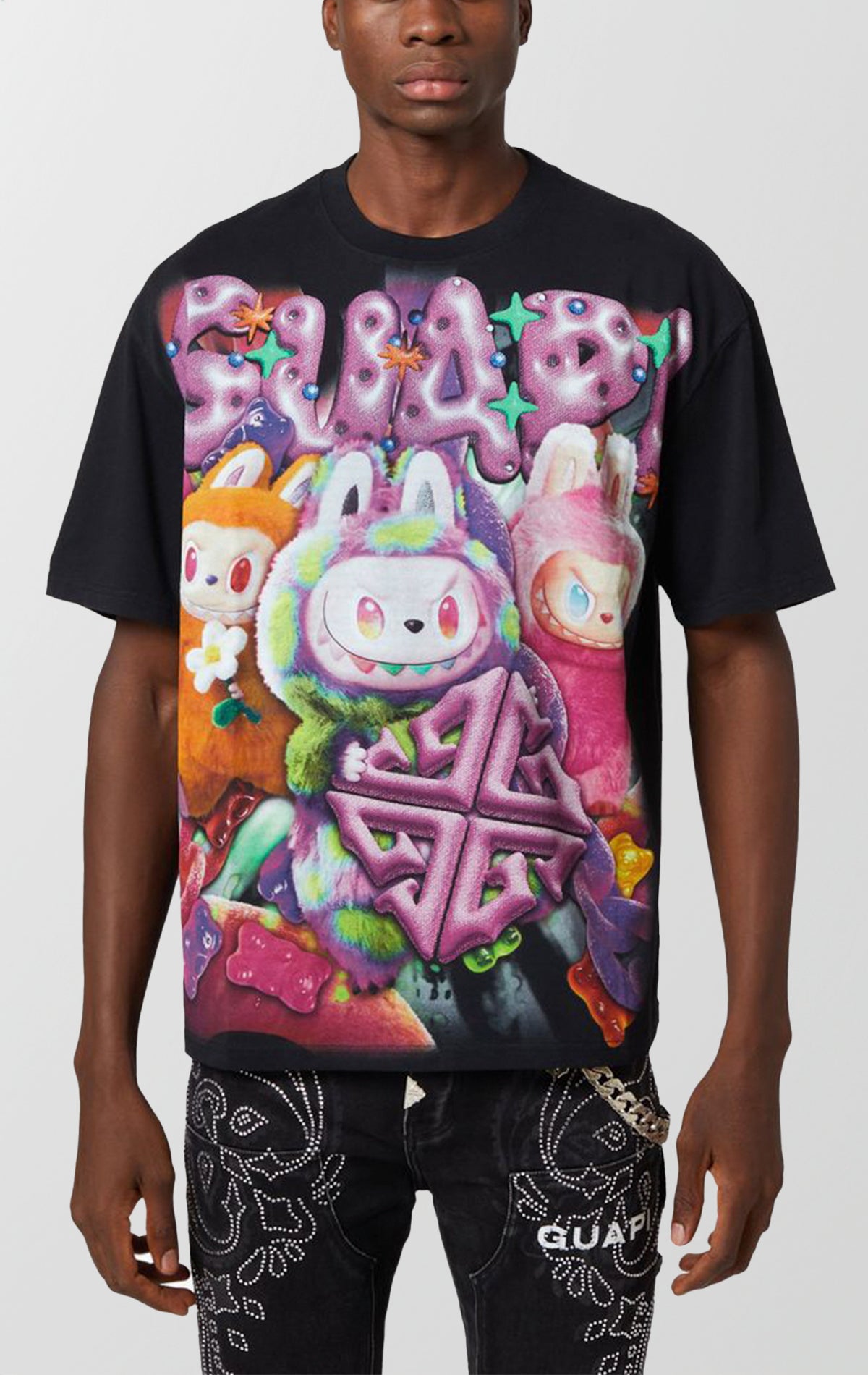 Enter a twisted candyland of chaos with the Candy Riot Tee V1. This oversized tee features fuzzy misfit bunnies and gummy characters clashing in a surreal world of sugar and rebellion. A playful graffiti-style logo pops at the top with bubbly lettering, while a soft but mischievous energy is reflected in the oversized 3D monogram across the front and back. Sweet, sinister, and unforgettable, this piece is available in both black and white colorways.