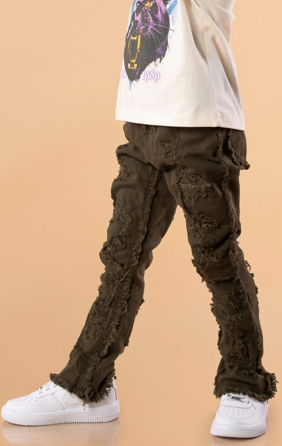 Designed for a modern streetwear vibe, these Kids Stacked Jeans feature an extra-long inseam that naturally gathers around the ankles to create a bold, layered effect. The stacked silhouette gives your child an on-trend look while still allowing room for movement and comfort. Available in Olive, Red, and Black, these jeans are perfect for adding personality and edge to any casual outfit.