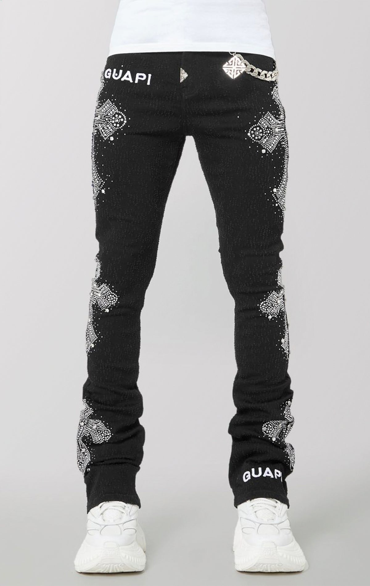 Crafted for bold expression, the Obsidian Black Distressed Cross Denim redefines luxury streetwear with its commanding presence. These black stacked jeans are sculpted in a skinny fit and fully adorned with shimmering rhinestone cross motifs—each intricately set to create an armor-like appeal. The design features custom diamond-patterned metal hardware and a detachable silver-tone chain for added edge. A subtle distressed texture runs through the fabric, giving the denim a raw, tactile finish that contrasts sharply with the refined crystal embellishments.