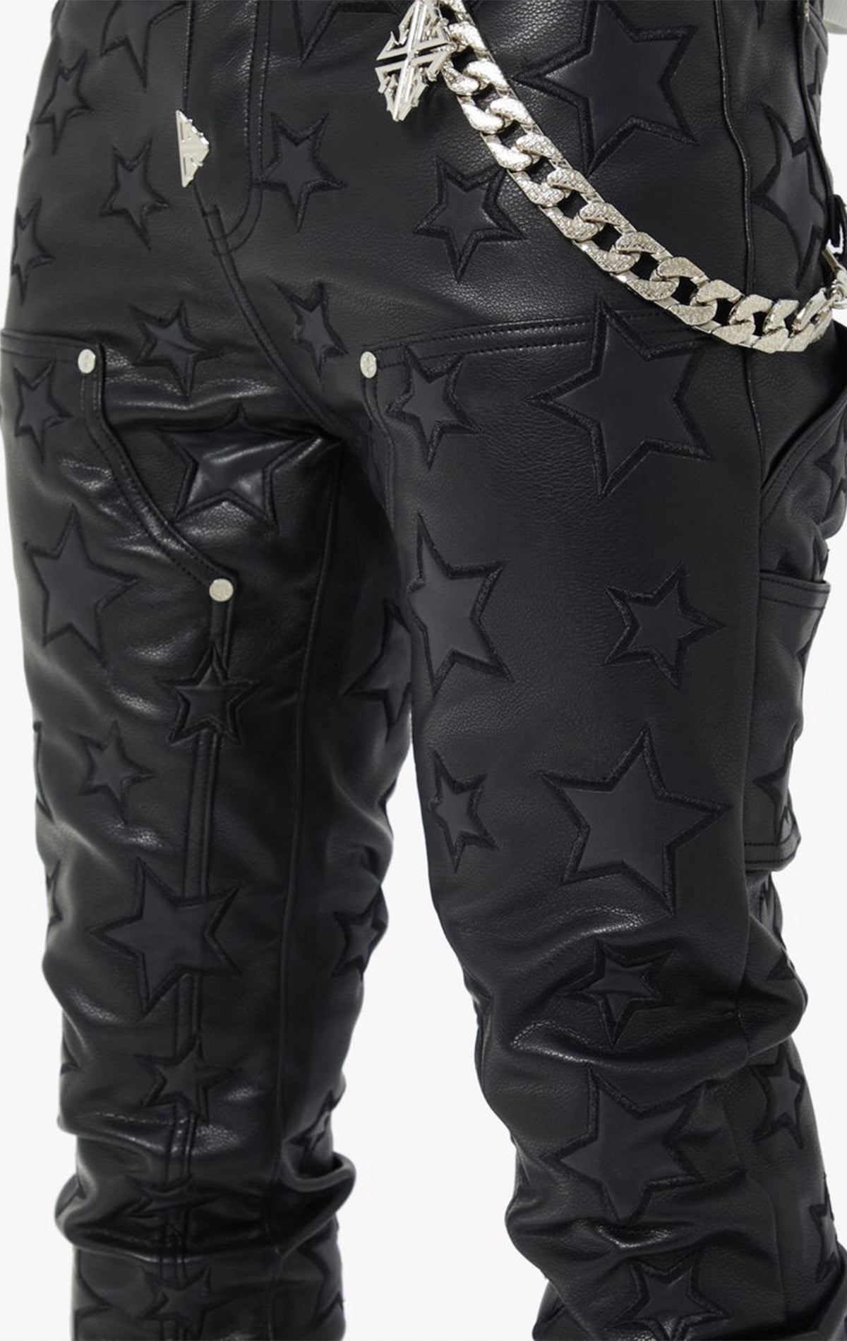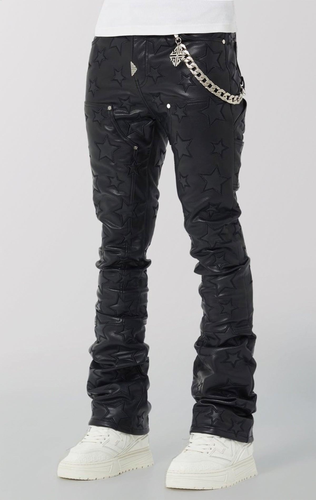 Redefine luxury with the Obsidian Black Stars Leather Pant, a bold fusion of texture and striking detail. Crafted from premium black leather, these pants feature an all-over embossed star motif that adds depth and a "cosmic edge" to a sleek monochrome aesthetic. Cut in a slim, stacked fit to elongate the leg, the supple leather offers both structure and flexibility. Finished with chrome hardware and a detachable chain, these pants transition effortlessly from high-street styling to stage-ready energy.