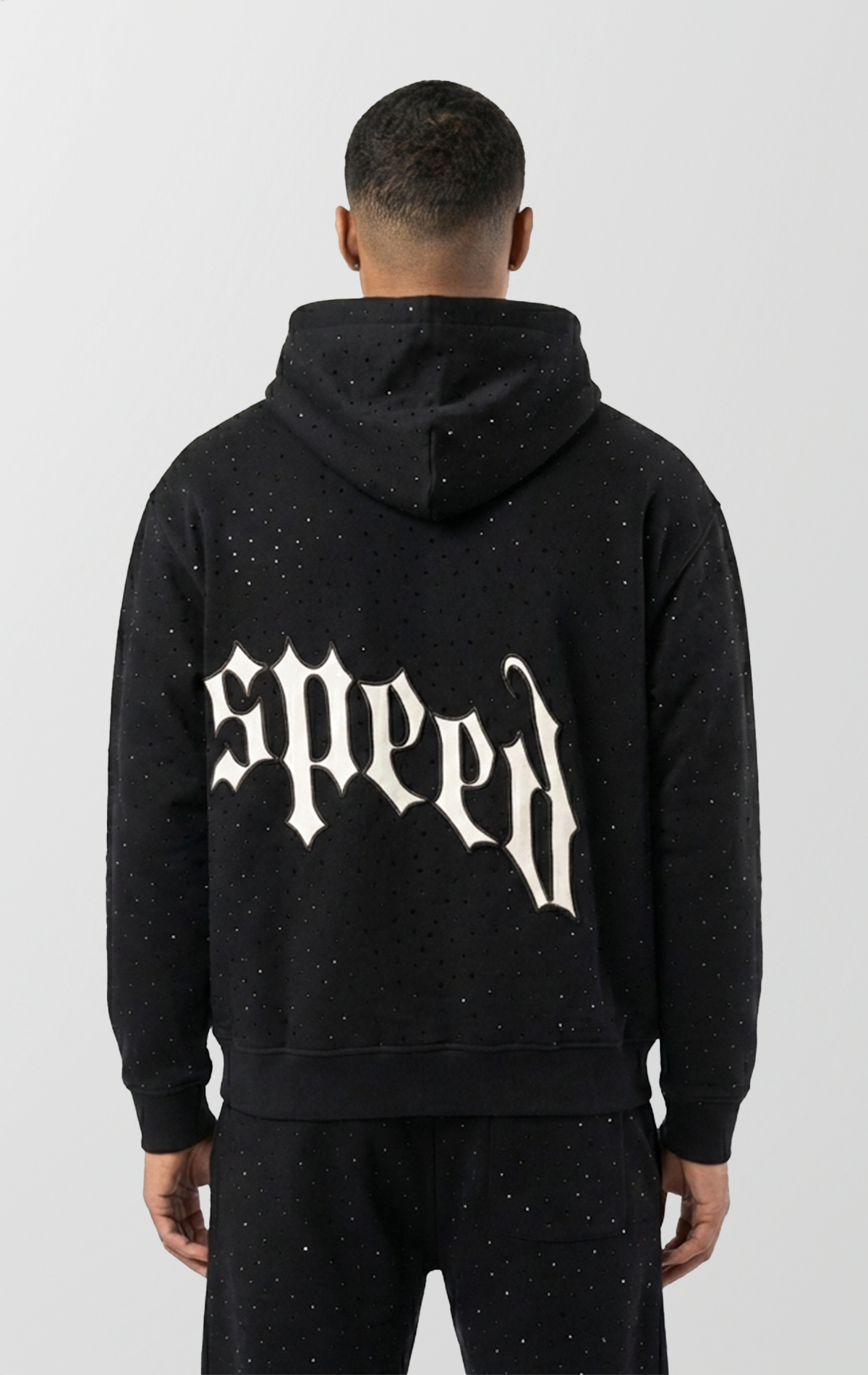 Make an undeniable statement with the Godspeed OG Logo VVS Sweatsuit V2. This isn't just a tracksuit; it's a piece of wearable art designed for those who demand the spotlight. The entire black full-zip hoodie and matching sweatpants are covered in a "VVS" effect pattern of small, sparkling crystals, catching the light from every angle for a high-end, iced-out aesthetic.
